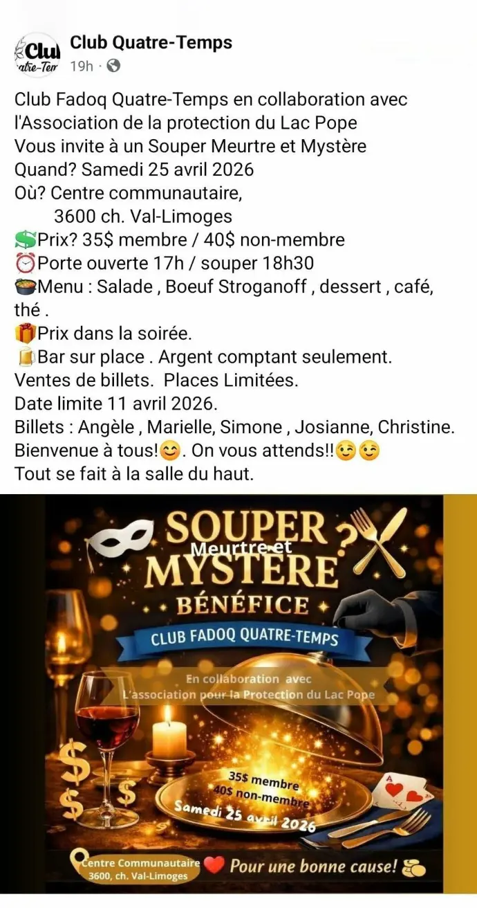 Souper Meurtre et Mystère - Club Fadoq Quatre-Temps en collaboration avec  l'association pour la protection du Lac Pope